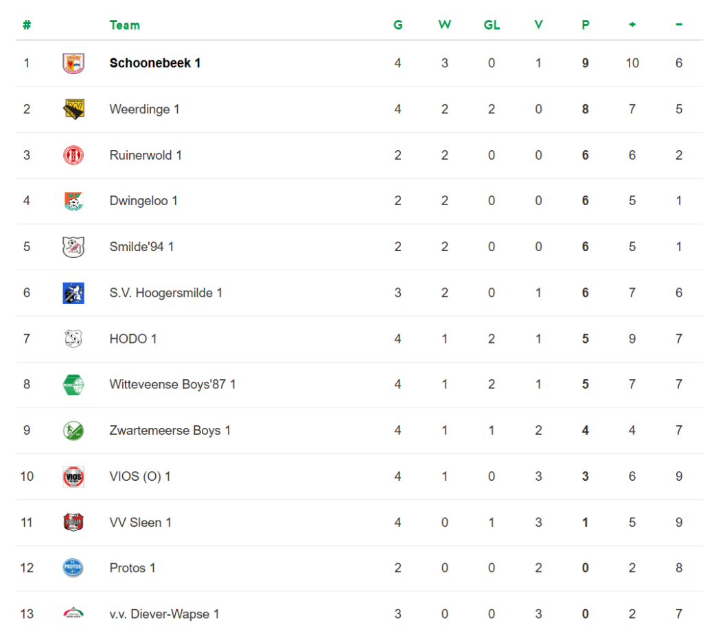 Na de wedstrijd treurden ze bij Protos, ze hadden Schoonebeek goed in bedwang maar als je de kansen niet benut… Volgende week heeft Protos een nieuwe kans, dan staat de inhaalwedstrijd tegen Dwingeloo op het programma. Bij Schoonebeek waren ze superblij, met de nieuwe tribune, het gerenoveerde hoofdveld en de drie punten. Het werd dan ook nog erg gezellig na de wedstrijd. Volgende week is Schoonebeek vrij, de week erop mag het op bezoek bij Ruinerwold.